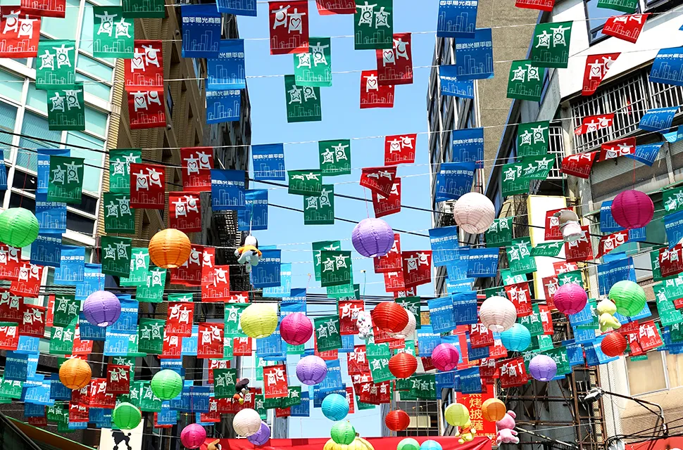 四平陽光商圈與夜市最大不同在於它是日間開放。街道徒步區上隨處可見露天咖啡座及咖啡香、不定時的街頭藝人表演驚喜、懸掛於天空隨風飄揚的四色布旗,讓這條不算長的徒步區增添了許多浪漫情懷與無限想像過去。