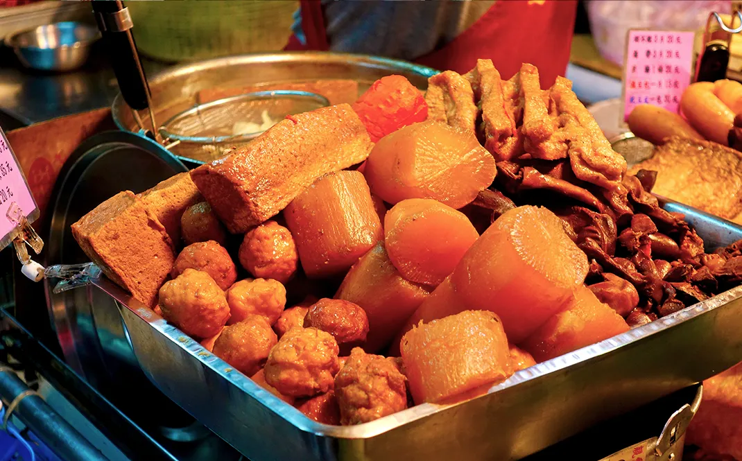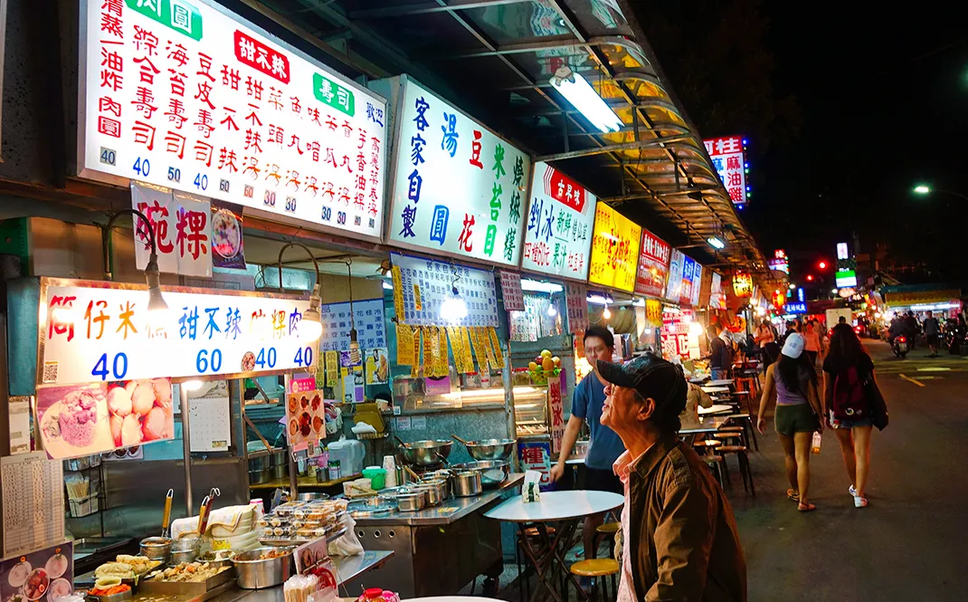 小型夜市,設有販售蚵仔煎和燙魷魚等台灣特色料理的攤位