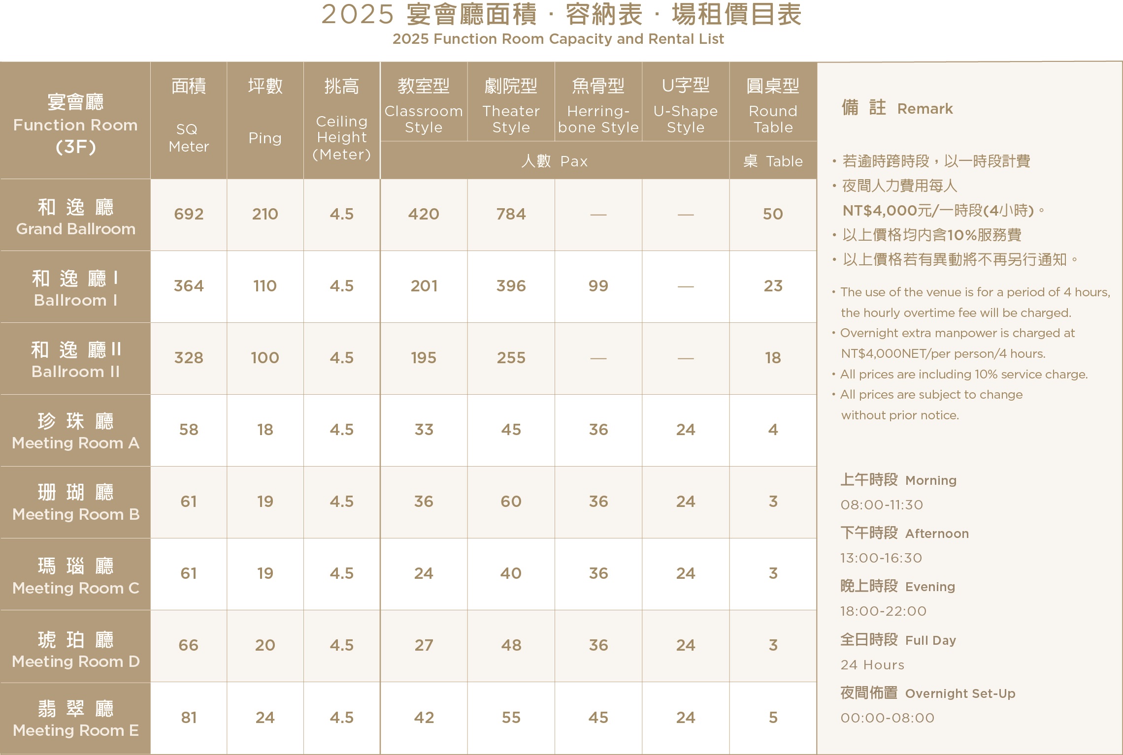 | Package Rate | NT$ 2,000+10%/Pax |